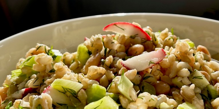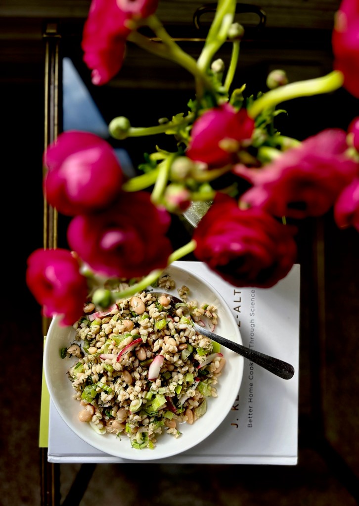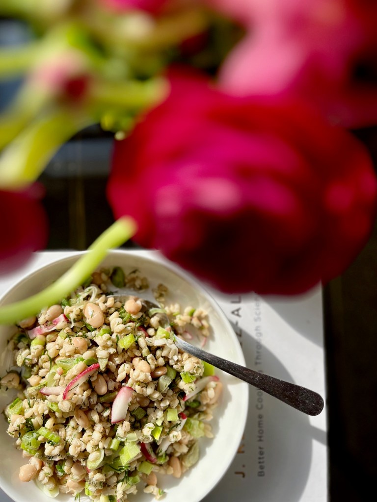 A combination of a whole grain, light flavorful vinegarette, and lots of spring vegetables makes for a high protein, high fiber, vegetarian salad, side dish, or one bowl meal. Great as a side for Easter Ham or Lamb. Come on in Spring.