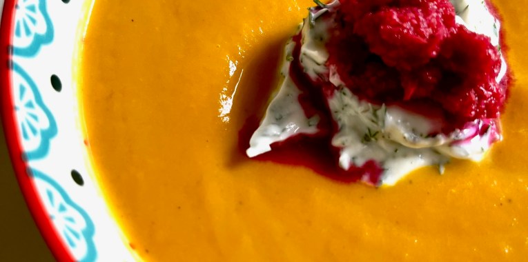 Preheat oven to 400 degrees. Peel carrots, remove ends, and cut into 1-2″ chunks. Place carrot chunks on a sheet pan, drizzle with olive oil and add salt and pepper. Toss around to coat carrots. Place in oven and roast for 15-20 min until fork tender. While carrots cook, clean and chop celery, garlic and leeks, using only the white and lightest green part of the leeks. Place celery, garlic, and leeks in a soup pot with 2 T butter, a sprinkle of kosher salt and cracked pepper, cook on med/low until tender. Add stock and roasted carrots. Simmer on med/low for 20-30 minutes. Get out the blender. In batches, blend warm mixture until smooth, then return to pot. Once all soup is pureed, stir in 1/2 and 1/2, taste for salt and pepper and adjust accordingly. For garnish, mix 2-3 T of chopped dill, and 1-2 T chopped mint, into creme fraiche or sour cream. Place a dollop on each bowl of soup and top with a dab of beet horseradish (available in the refrigerated case near dairy products). This can be served warm or cold.