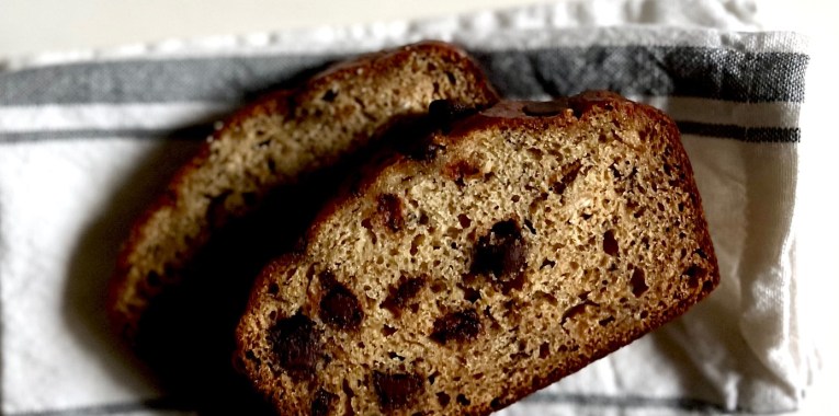 This was made on a whim from the bananas I thought I would start eating before I run. I didn’t eat them. But what I do like to eat before I run is a tear of banana bread, specificaly with chocolate chips. I sliced, then froze the loaf. I pull out a couple pieces at a time, keep them in the fridge, and just tear off hunks as needed.