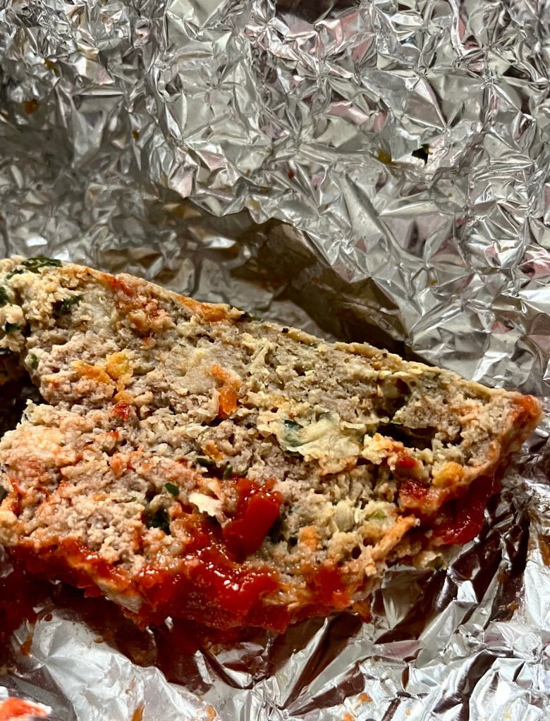Sauté carrot through chives in 1 T olive oil, seasoning with salt and pepper. Combine turkey through freshly ground black pepper and gently mix. Add in sautéed carrot mixture mix with hands, just until incorporated. Don’t over mix. Place mixture on prepared baking sheet and form into a loaf. Set aside and wash hands. Combine balsamic and ketchup in a small bowl and stir to combine. Spread ketchup mixture on top of meatloaf. Place in oven and bake about 1 hr or until it reaches 160 degrees inside the meatloaf. A meat thermometer is a must have. Inexpensive and tackles all the speculation stress. Let the meatloaf rest 5-10 min before slicing.