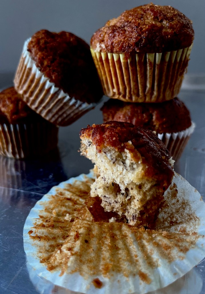 This experiment was inspired by aromas. I really love the smell of black pepper. I find it so complex and full of twists and turns. Bananas too have an intestong aroma that evolves wih the ripeness of the fruit. The best bananas for breads and muffins are the ones that almost squish out of the dark peel; a banana rarely eaten in the same way that a bright yellow banana is eaten. The result of my current curiosity sounds like something from a spell book. Grab the squishy brown bananas, and black pepper and take these charming muffins to a Halloween party. If you want to creep people out a little, up the amount of black pepper by a smidge.